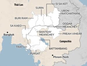 Phía Campuchia tuyên bố khu vực này có mốc biên giới cố định, song vẫn bị lực lượng Thái Lan tiến vào giao chiến. Campuchia ngày 11/12 đăng video cho thấy lực lượng nước này tiến vào chốt kiểm soát biên phòng Boeng Trakuon tại huyện Thmar Puok thuộc tỉnh Banteay Meanchey, tiếp giáp tỉnh Sa Kaeo của Thái Lan.