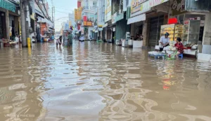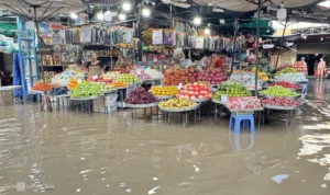 Cảnh tượng tương tự cũng diễn ra ở các khu chợ dân sinh. Người bán hàng phải đứng trong nước để phục vụ khách. Một số nơi, tiểu thương còn sáng tạo bằng cách kê ván gỗ làm lối đi tạm, biến khu chợ thành “chợ nổi” bất đắc dĩ.